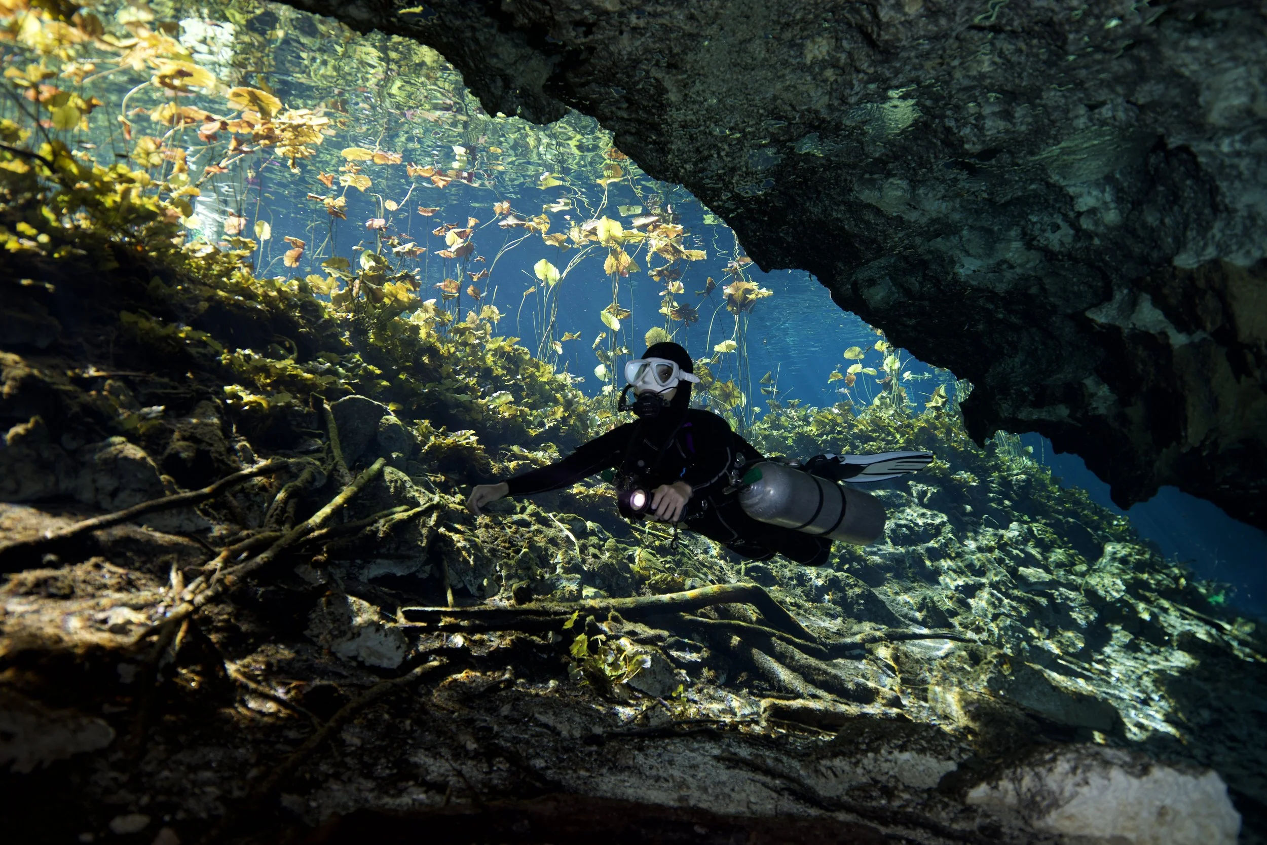 水中は意外にもダークな一面もあり、暗いエリアと明るいエリアが繰り返されるのが特徴。開口部の明暗のコントラストの美しさは、地形ダイビングでは定番のシーンですが、ここでは植物がアクセントとして加わるのがいいですよね。