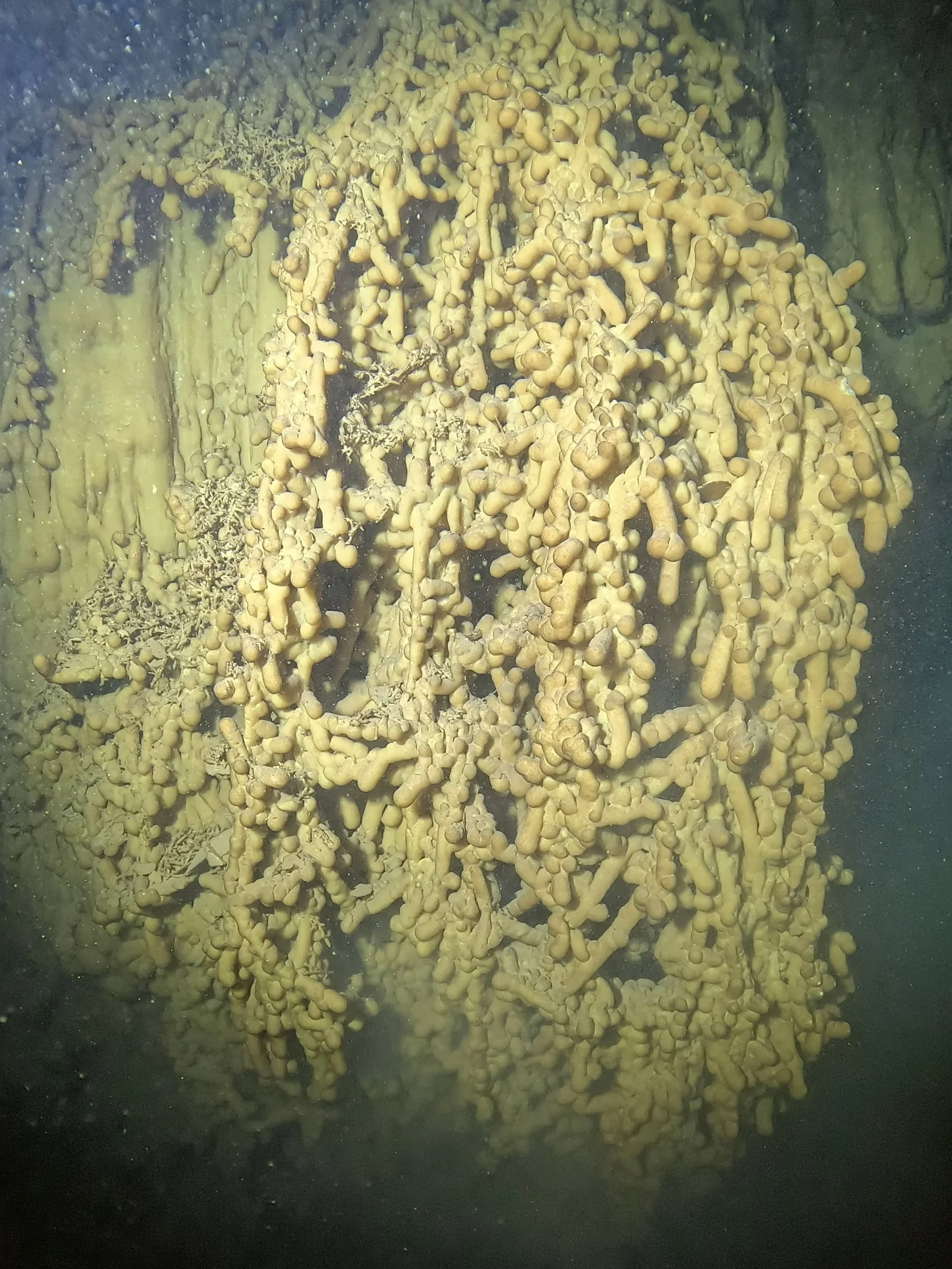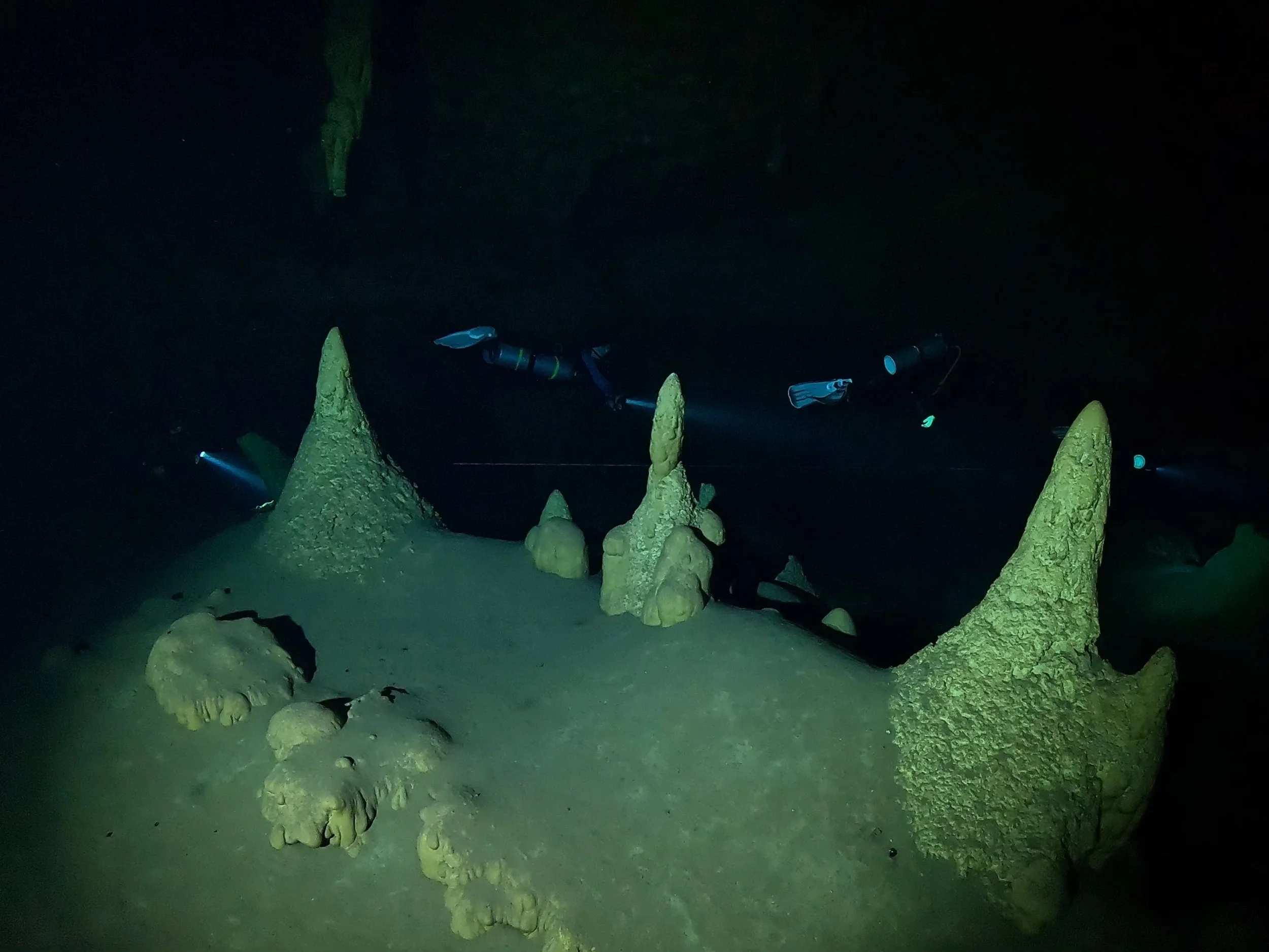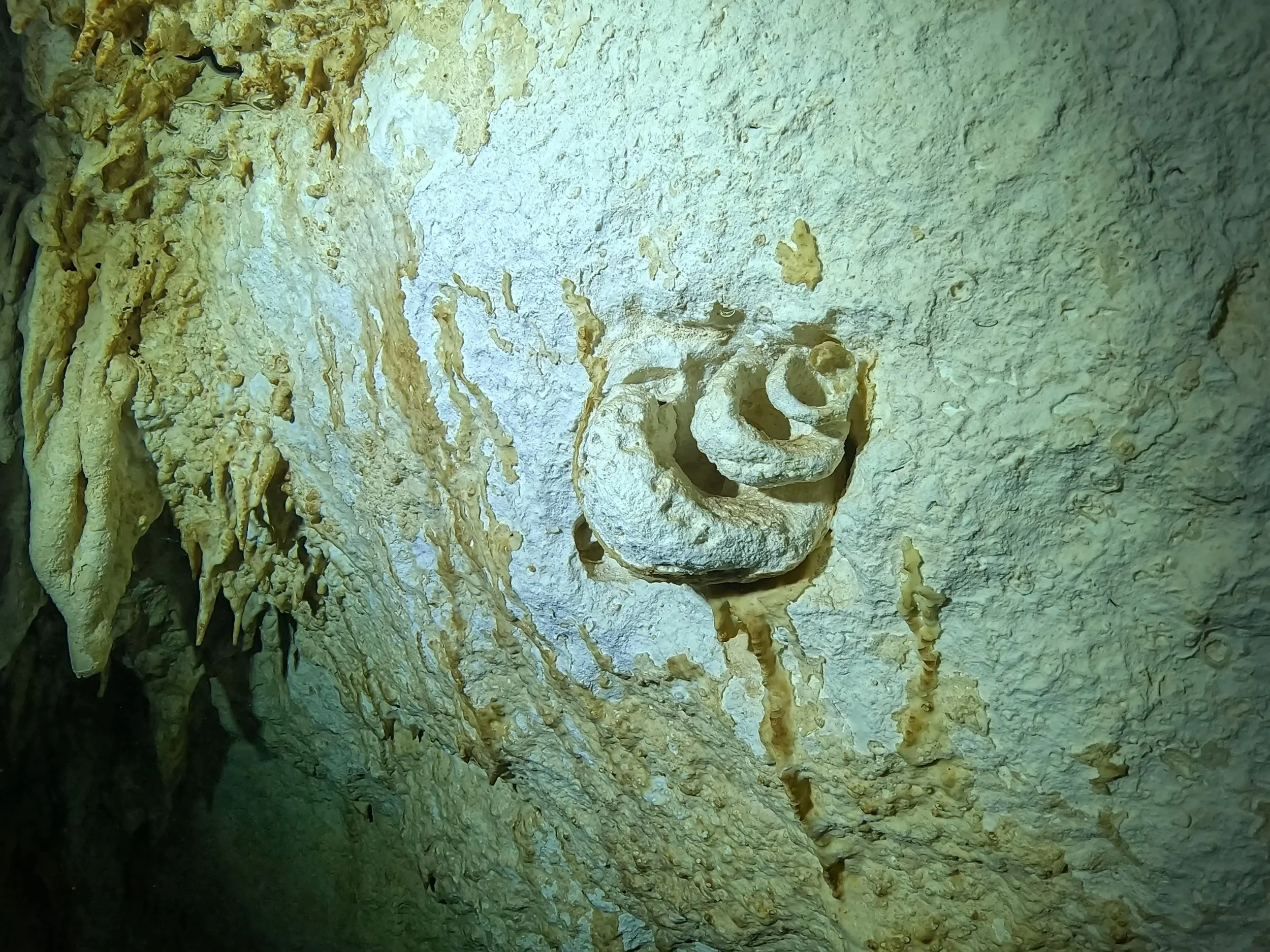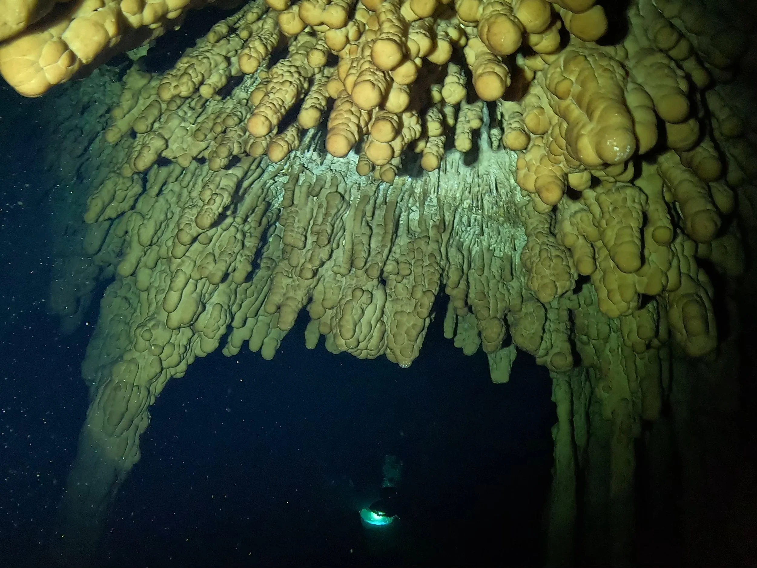 ですが、タクビルムの鍾乳石はどうでしょう。末広がりのとんがりコーンのような形、壁一面がポコポコとコブ状に形成されていたり。ぶどうの房のような形状もあります。このミステリアスさが一番のウリのセノーテです。