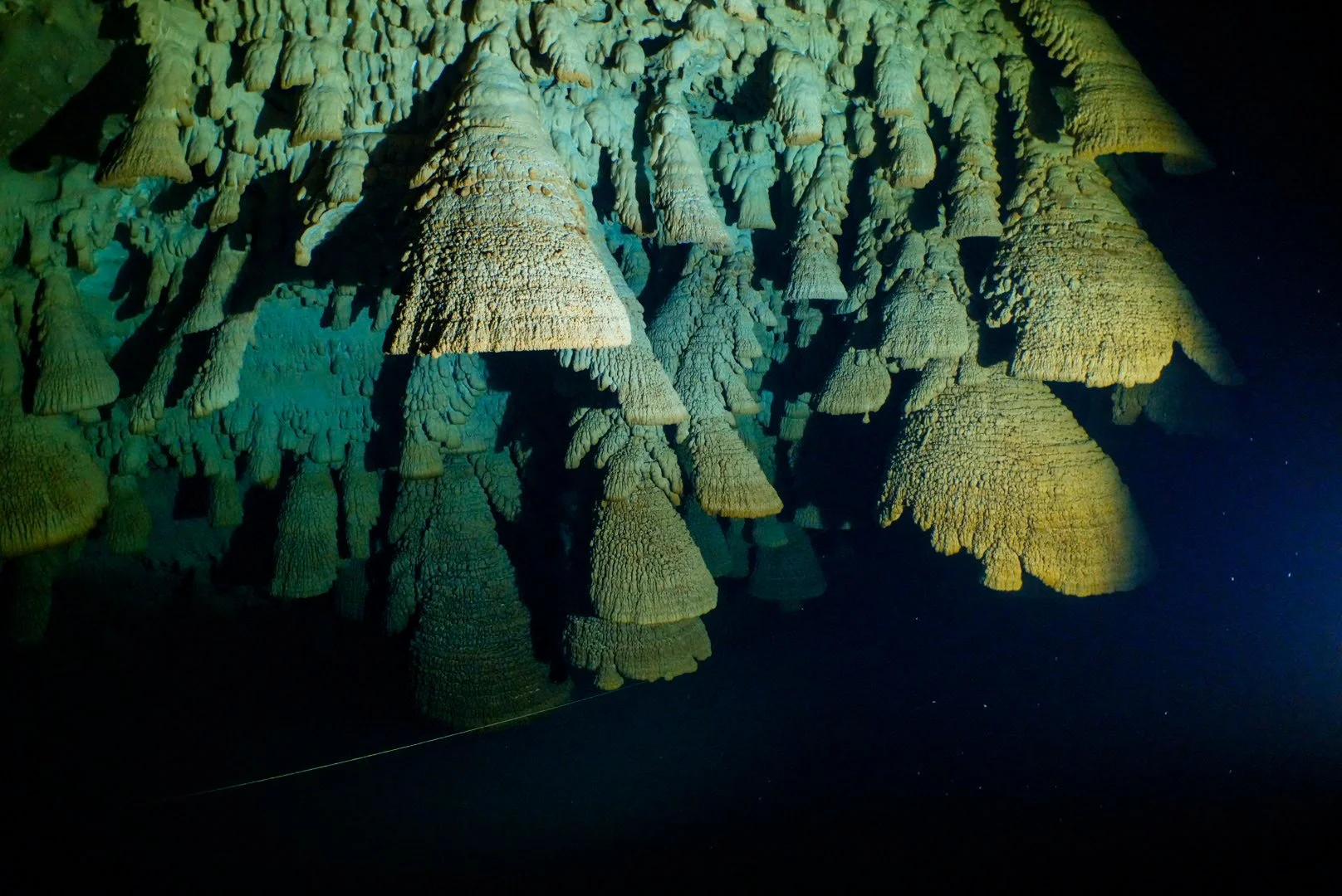 真っ暗闇の中、ライトに照らされて浮かび上がる鍾乳石の群生。通称「地獄の釣鐘」と呼ばれるその独特な雰囲気が、上手くキャプチャーされた一枚です。