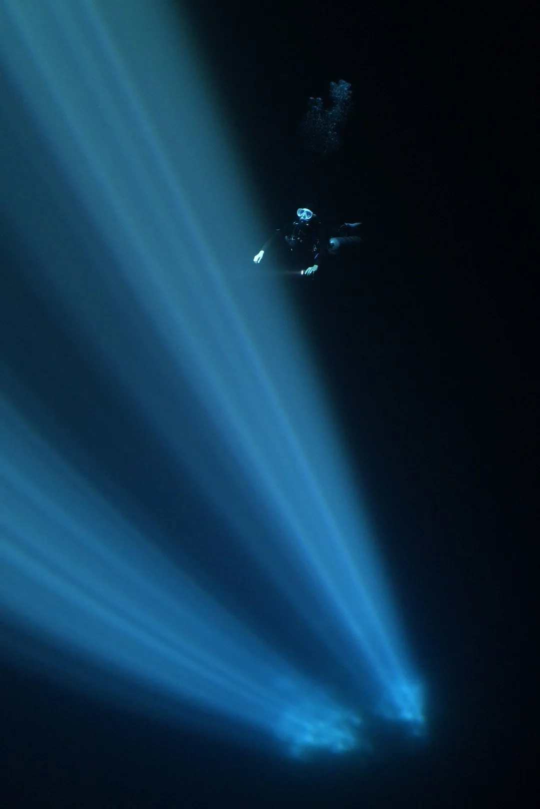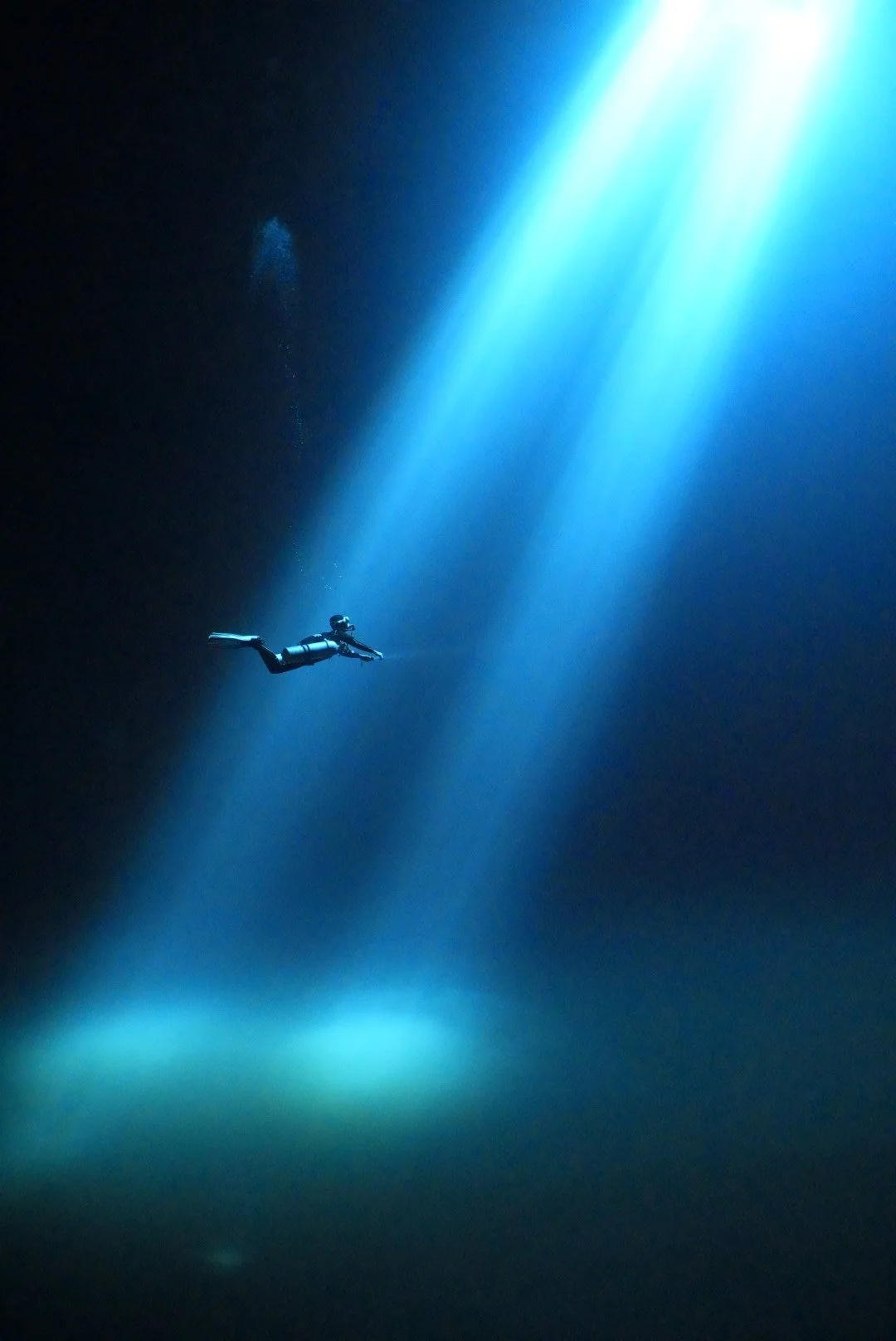 明、暗、そして境目に光を見上げるダイバー。