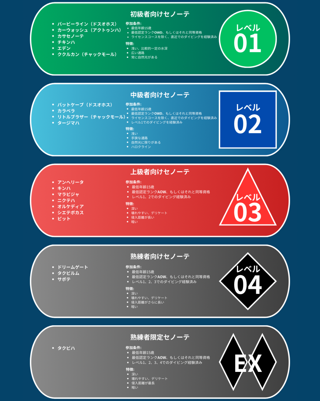 また上記、キンタナロー州のケーブインストラクターのグループが作成した、セノーテリストもご参考までに。セノーテという素晴らしい環境を保護し、セノーテダイビングが安全なものであり続けるために、各セノーテがレベル分けされ、推奨されている条件やセノーテの特徴が明記してあります。