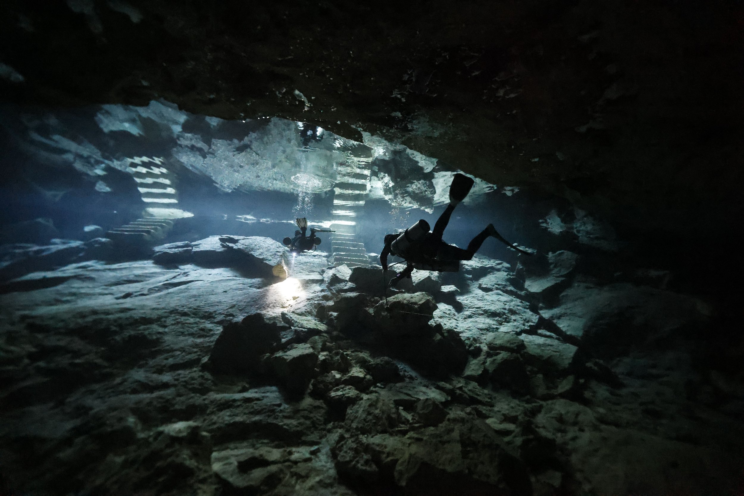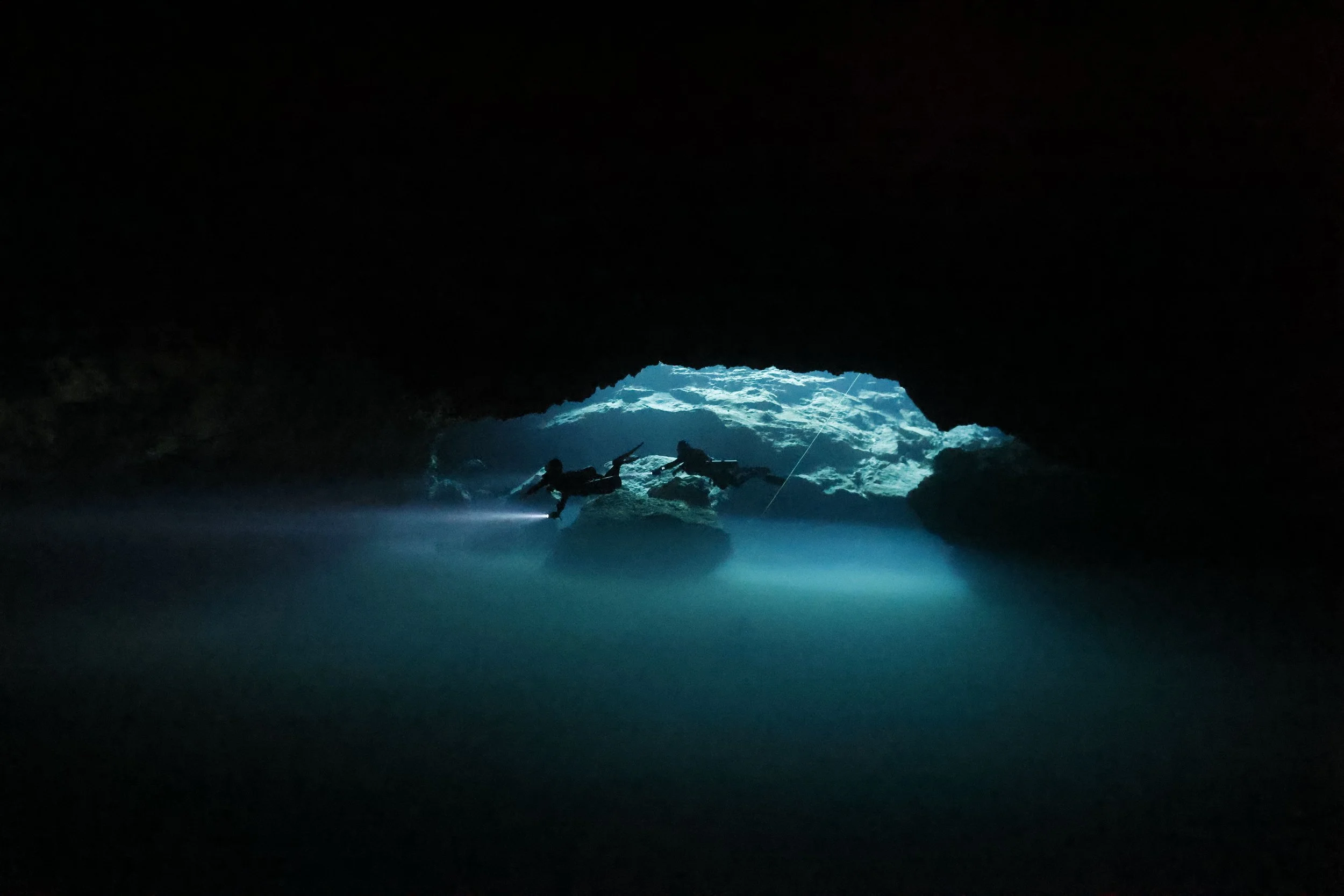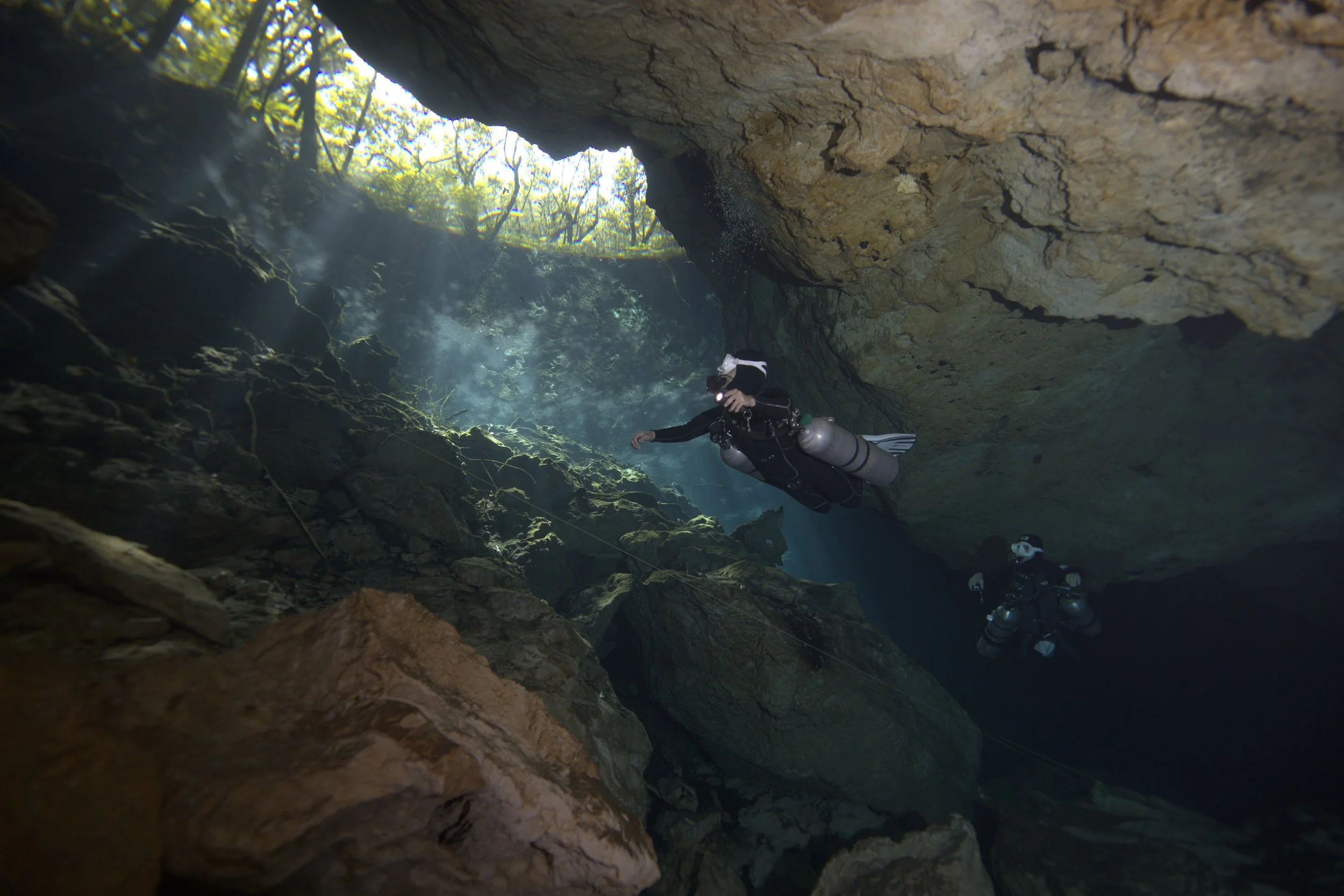 L字に引かれた水中のガイドラインを辿り、折り返して戻ってくるだけの 超単調 なルート。オープンウォーターエリアも広く、はじめてのセノーテダイビングへの慣らし運転にはうってつけ。それでいて、晴れた日の光にはこの上なく感動させられるものです。