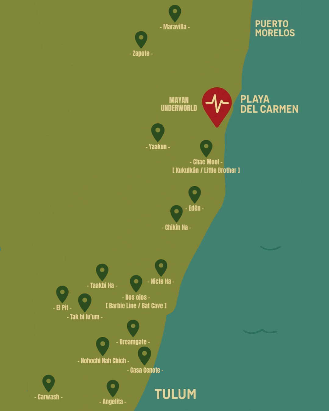 制限なく、レクリエーショナルダイバーの皆さまをご案内できるセノーテを数えてみると、その数は16箇所。そのひとつひとつが全く異なる景観や見どころのバリエーションに富んでいます。