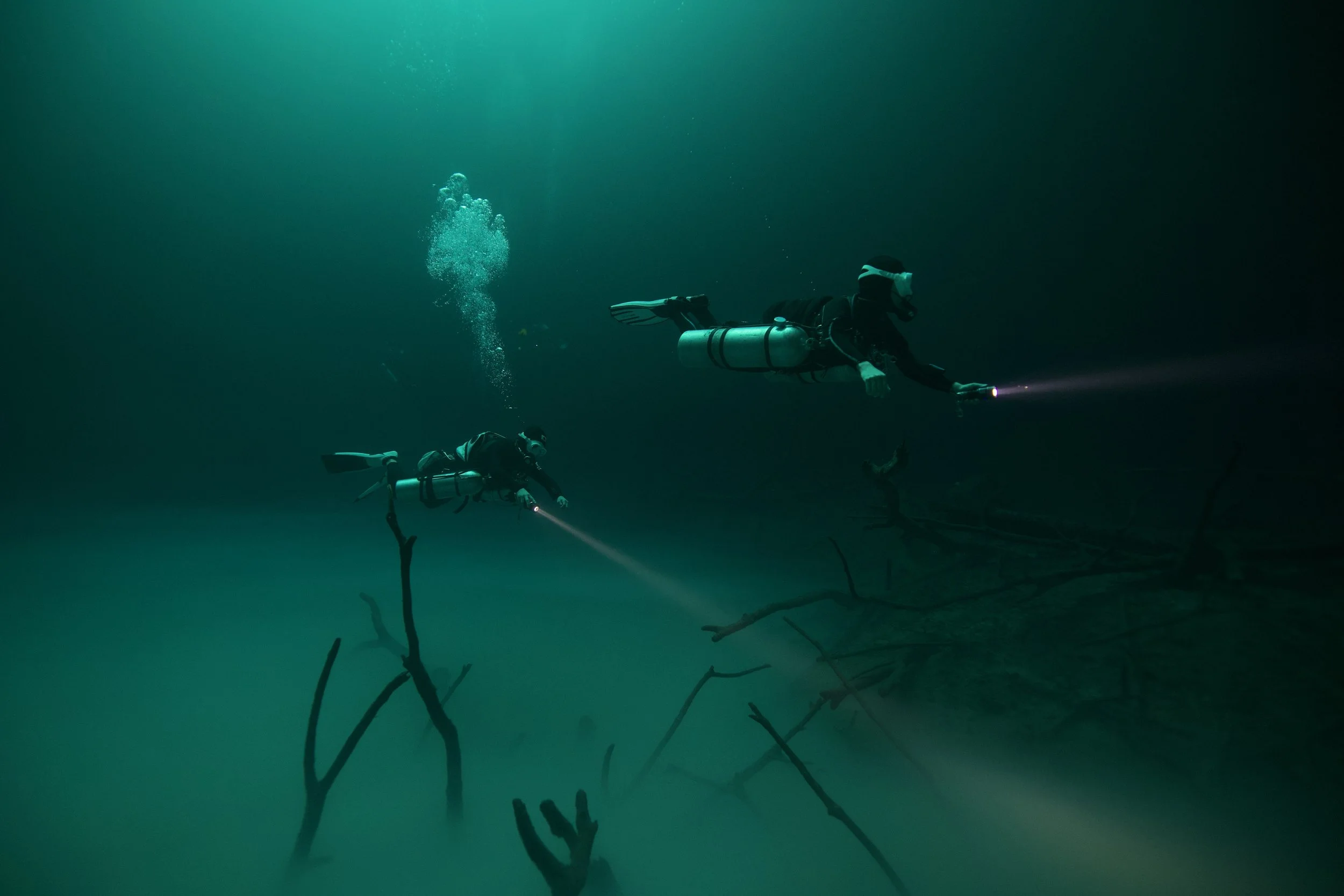 KUJIRA DIVEさんも、連日エンリッチドエアを使用していただいており、余裕をもったダイビングができているため、この雲の下の世界までご案内させていただきました。1mほどの硫化水素の層を抜けると、落ち葉から染み出したタンニンによって、水の色味が赤茶色く染まった世界に包まれます。